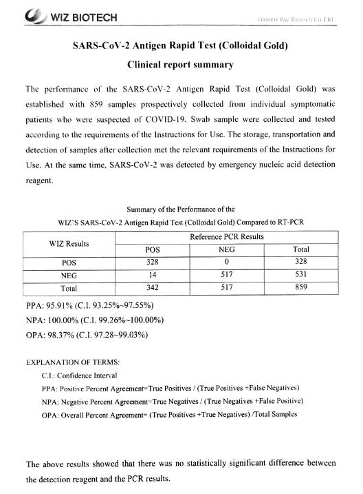 SARS-CoV-2 Antigen Rapid Test (Colloidal Gold) with a top quality 95.91% sensitivity and 100% specificity, listed in the EU, WHO, and the German BfArM list as well. SARS-CoV-2 Antigen Rapid Test (Colloidal Gold) is intended for the qualitative detection of SARS-CoV-2 Antigen (Nucleocapsid protein) in nasal sample from patients with suspected SARS-CoV-2 infection within the first 7 days after symptom onset in vitro.